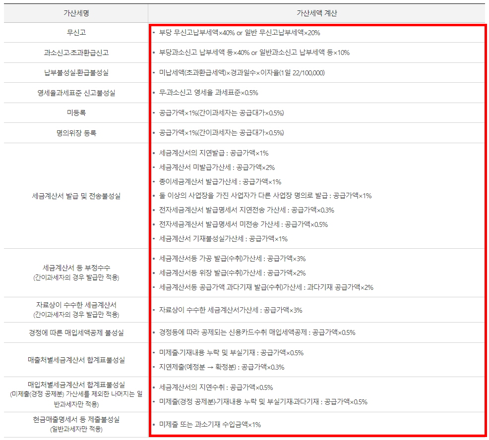 부가세(부가가치세)를 신고하지 않을 경우 '가산세'가 부과됩니다. 무신고 가산세, 과소신고 가산세, 납부지연 가산세, 무기장 가산세 등 상황에 따라 다른 가산세율이 적용될 수 있으니 위 가산세율을 참고하시어 꼭! 신고기한내 해주시기 바랍니다.