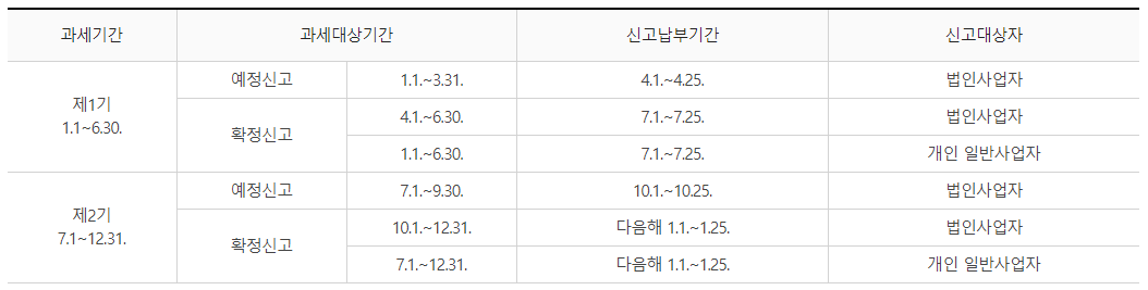 ① 일반적인 경우 법인사업자는 1년에 4회, 개인사업자는 2회의 신고를 하게 됩니다.(아래 이미지 참조)