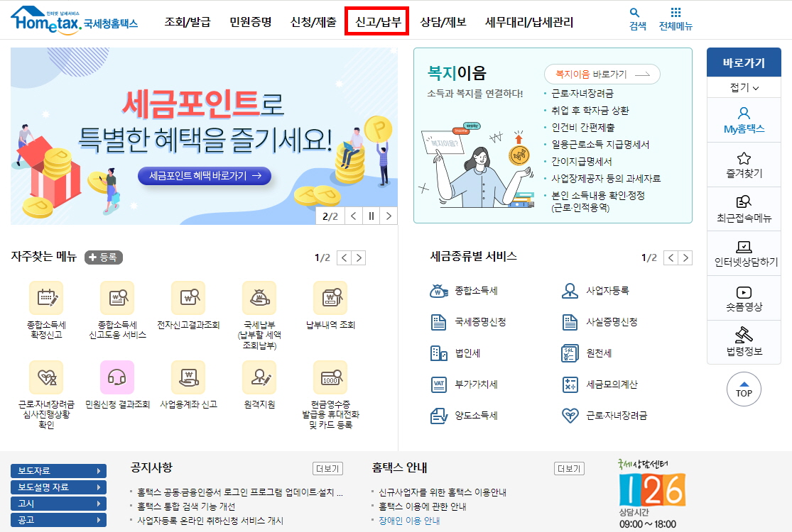 종합소득세 신고와 동일하게 국세청 홈택스 접속 후 셀프 신고가 가능합니다. 위의 안내 이미지를 따라 신고하시면 되겠습니다.